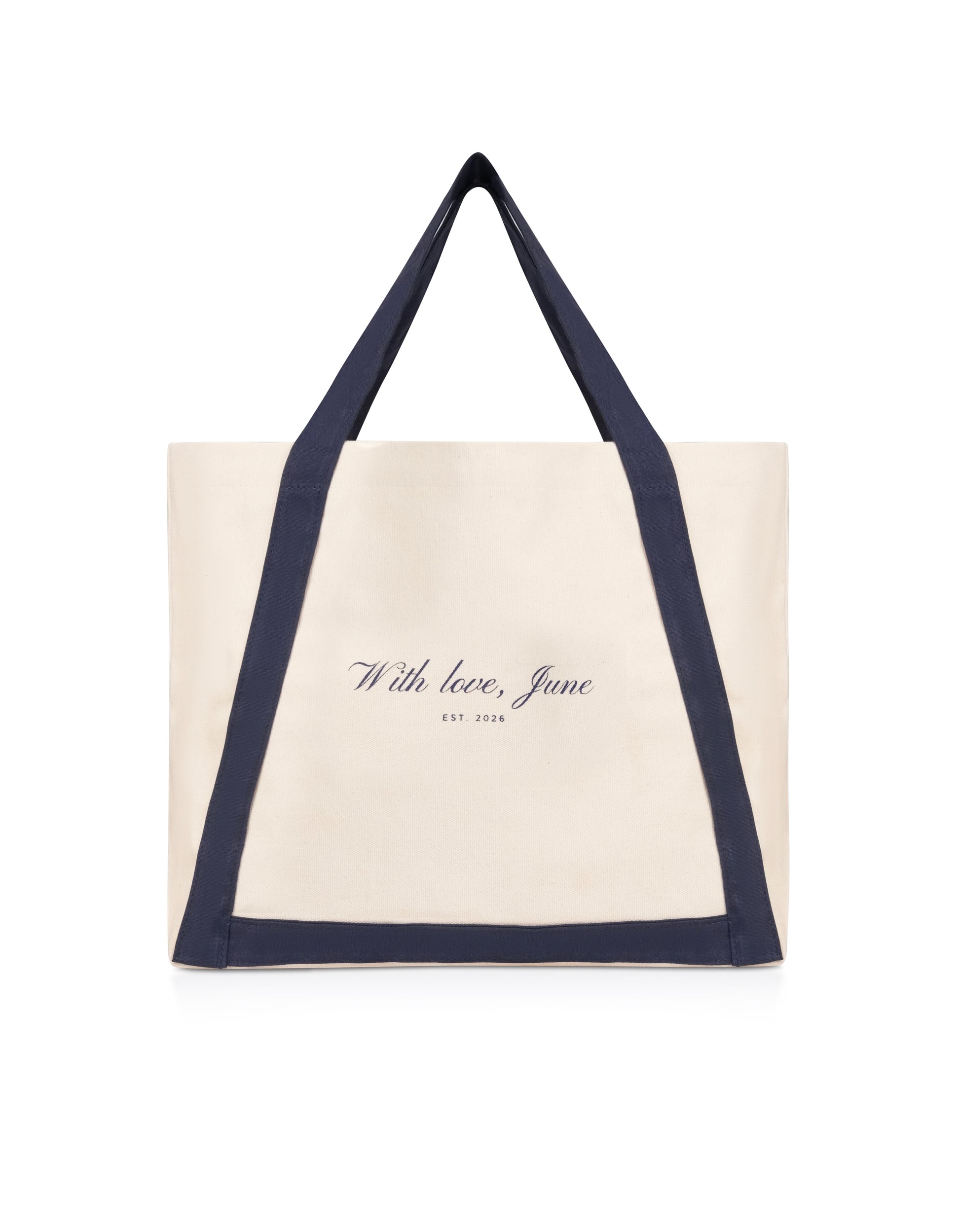 Durable canvas tote with contrast trim and “With love, June” embroidered logo on the front.